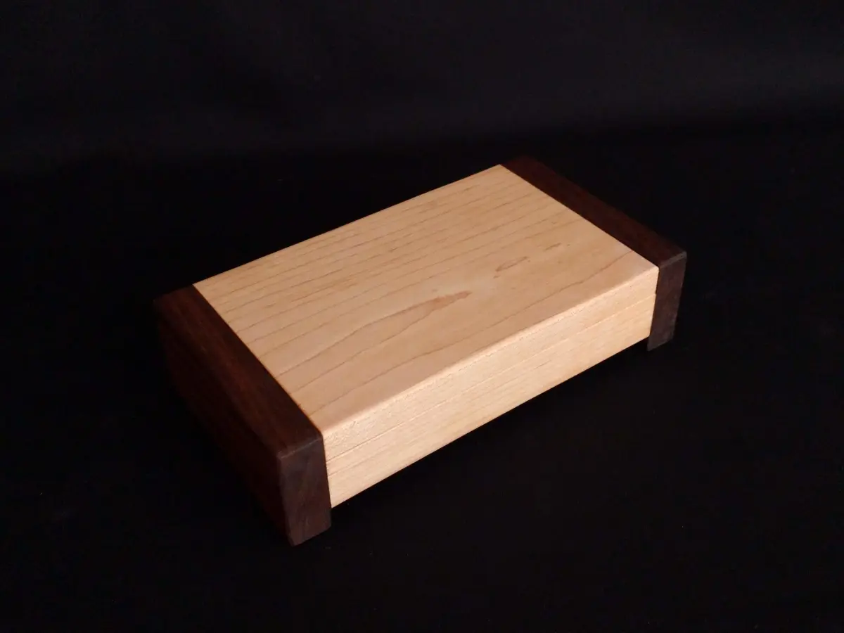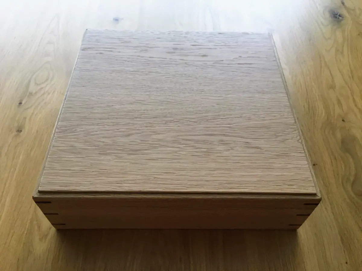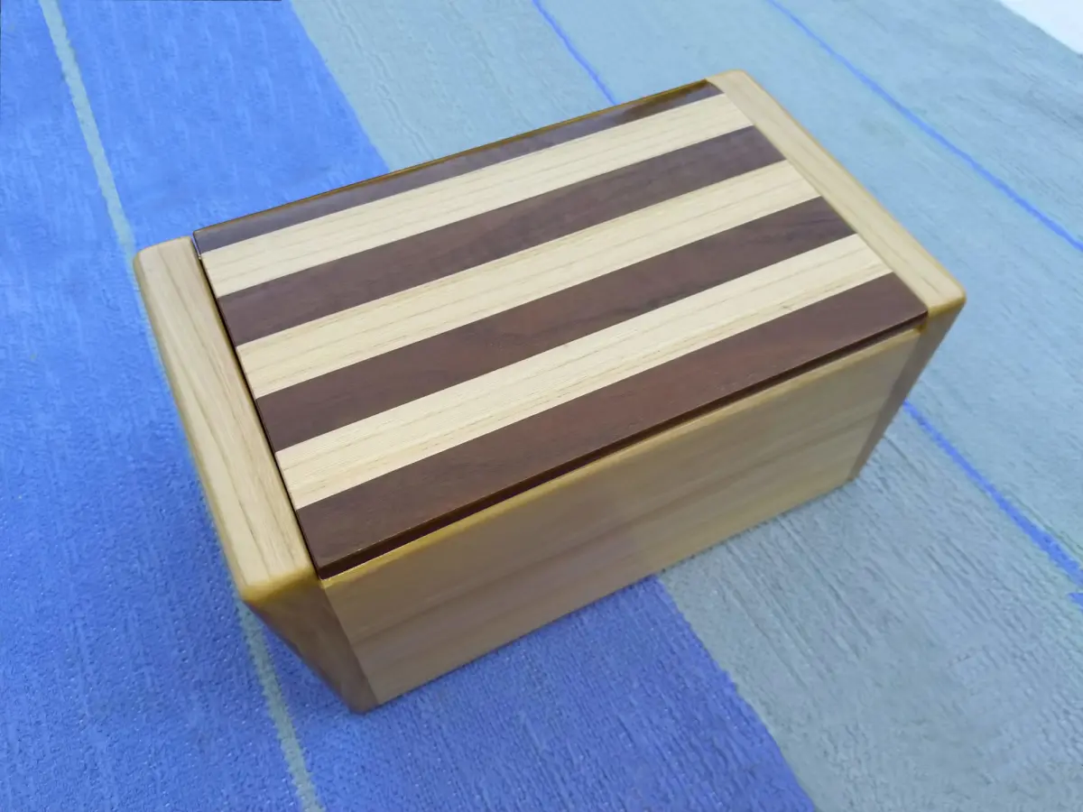 Het deksel van dit kistje is van een restant esdoorn, dat een erg mooie tekening had. Er zit een golf patroon in dat een mooi diepte-effect heeft.