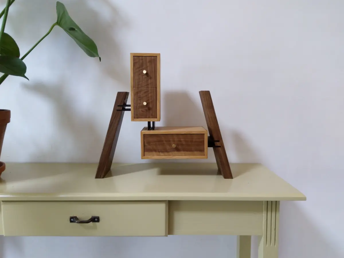 De notenhouten omlijsting trekt de aandacht naar de tekening toe. Het frame van het kistje is van essen, en de hoeken zijn bekleed met een noten profiel, en dienen ook als pootjes.